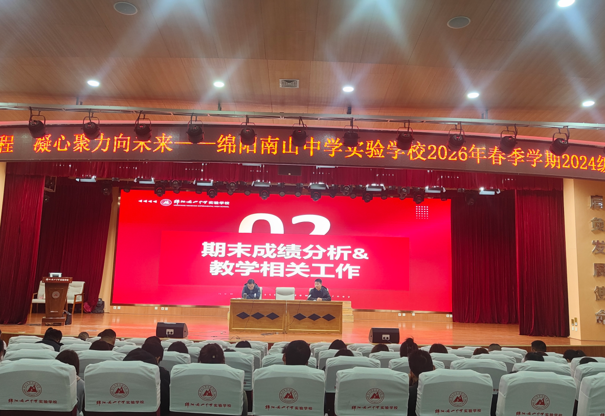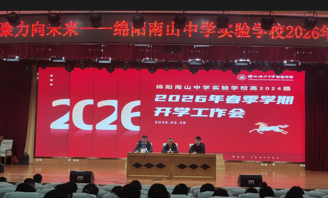 春归万物苏,奋进正当时。2026年2月28日上午9时,绵阳南山中学实验学校高2024级新学期开学工作会议在学校第一学术厅召开。本次会议以“策马扬鞭启新程,凝心聚力向未来”为主题,旨在总结过去、规划未来,为新学期教育教学工作开好局、起好步。年级全体教师精神饱满,齐聚一堂,共同开启丙午马年的崭新篇章。