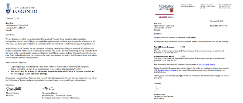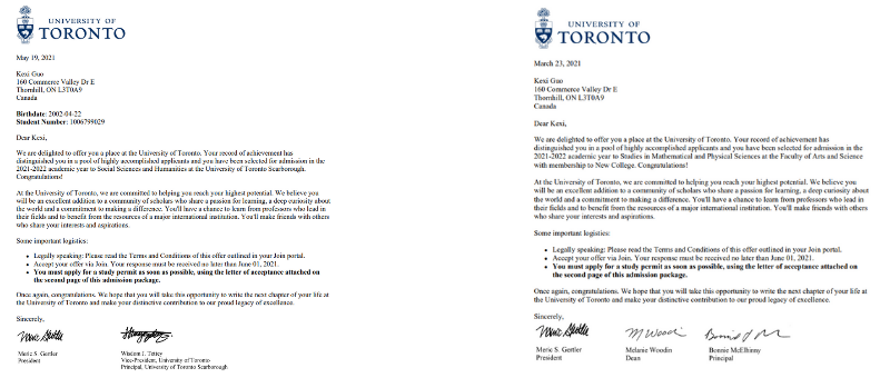 郭柯汐同学在接下来一年反复经历停课、网课、复课的过程中,不仅没有浮躁和退缩,反而沉下心来认真准备。国内曾经的同学已经就读大一,海外拼搏的郭同学仍在默默努力,静待花开,最终,皇天不负有心人,郭同学在2021年收获了包括多伦多大学三个校区和麦克马斯特大学在内的数封世界顶尖大学的offer。(多伦多大学2022年世界排名第26位)