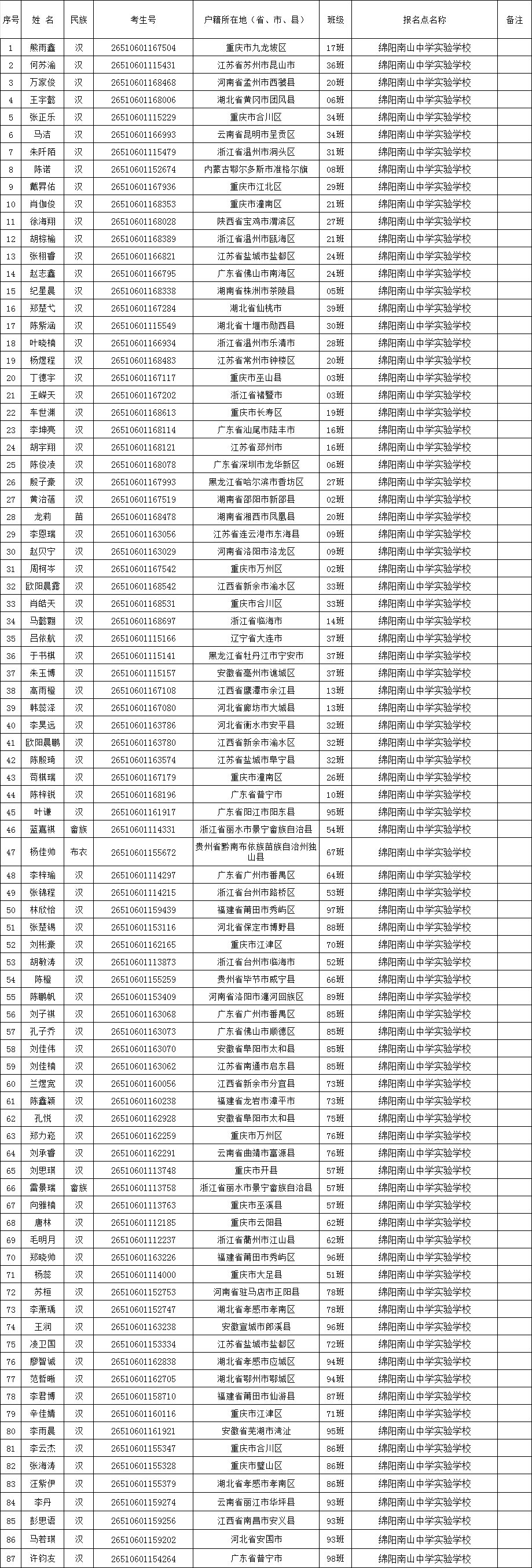 依据涪城区考试中心 2026 年高考报名工作会议精神,以及四川省人民政府办公厅《关于转发教育厅等部门四川省进城务工人员随迁子女在当地参加升学考试实施方案的通知》(川办发〔2012〕77 号)之规定,下列学生符合随迁子女报名条件,现予以公示: