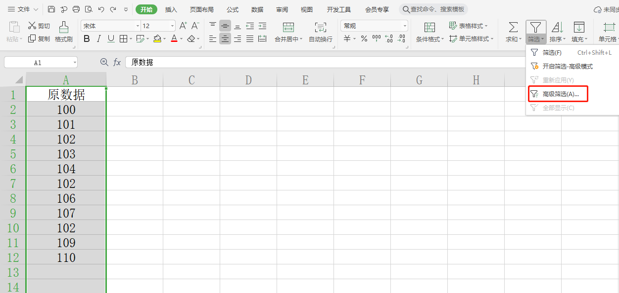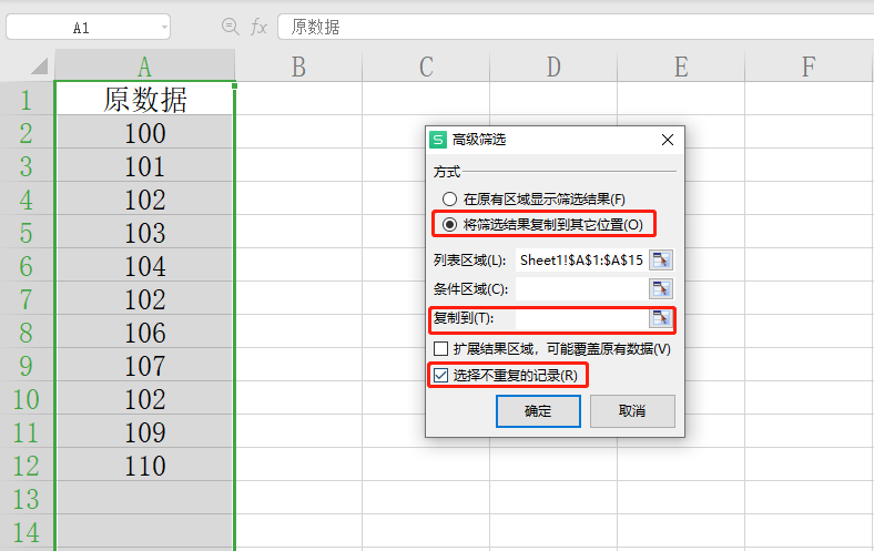 选择A列,在开始菜单中找到筛选选项,在筛选下拉列表中选择高级筛选,在高级选项中选择“筛选结果复制到其他位置”,复制到区域选择C列,勾选“选择不重复的记录”,即可完成唯一值选择。