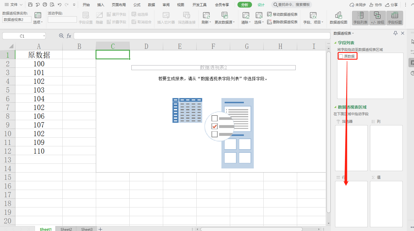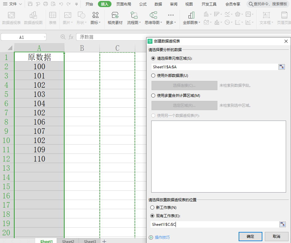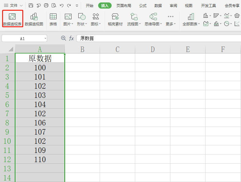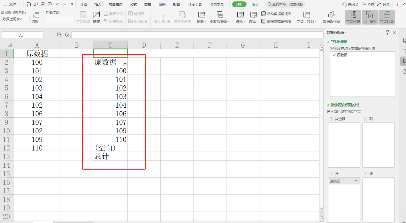 选择A列,在插入菜单栏中选择“数据透视表”,根据需要在“选择防止数据透视表位置”里选择数据存放位置(示例中选择的C列),将原数据字段拖至行标签即可显示唯一值。