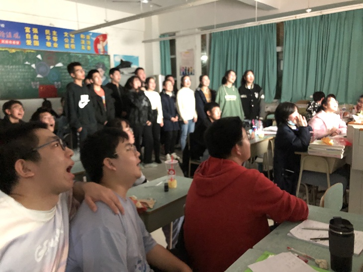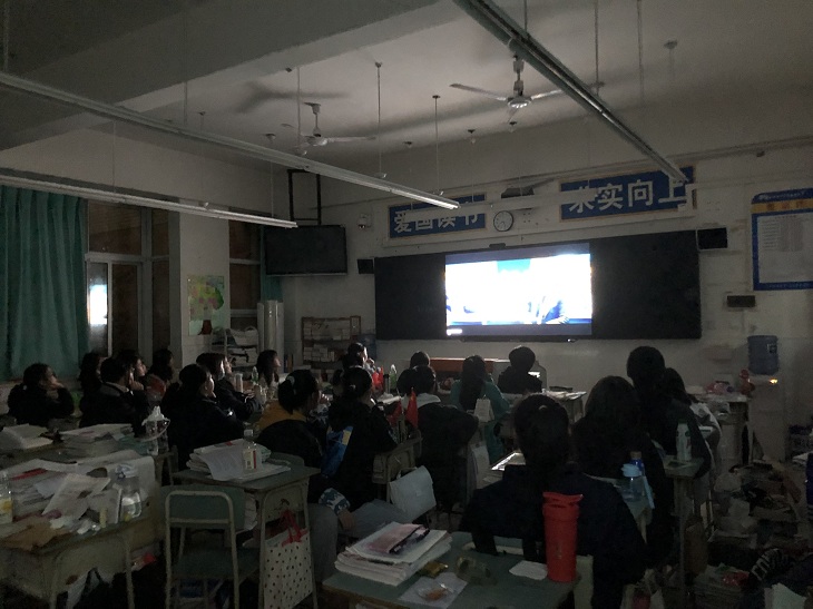 晚上,各班组织集体观看爱国励志电影。《中国医生》《捌佰》《建军大业》《金刚川》《战狼》《我和我的祖国》《长津湖》等等使同学们既调节了自己,又接受了爱国主义、集体主义教育。有的班级还自购了小零食,组织了丰富多彩的班级游戏等。教室里响起了一阵又一阵欢呼声。